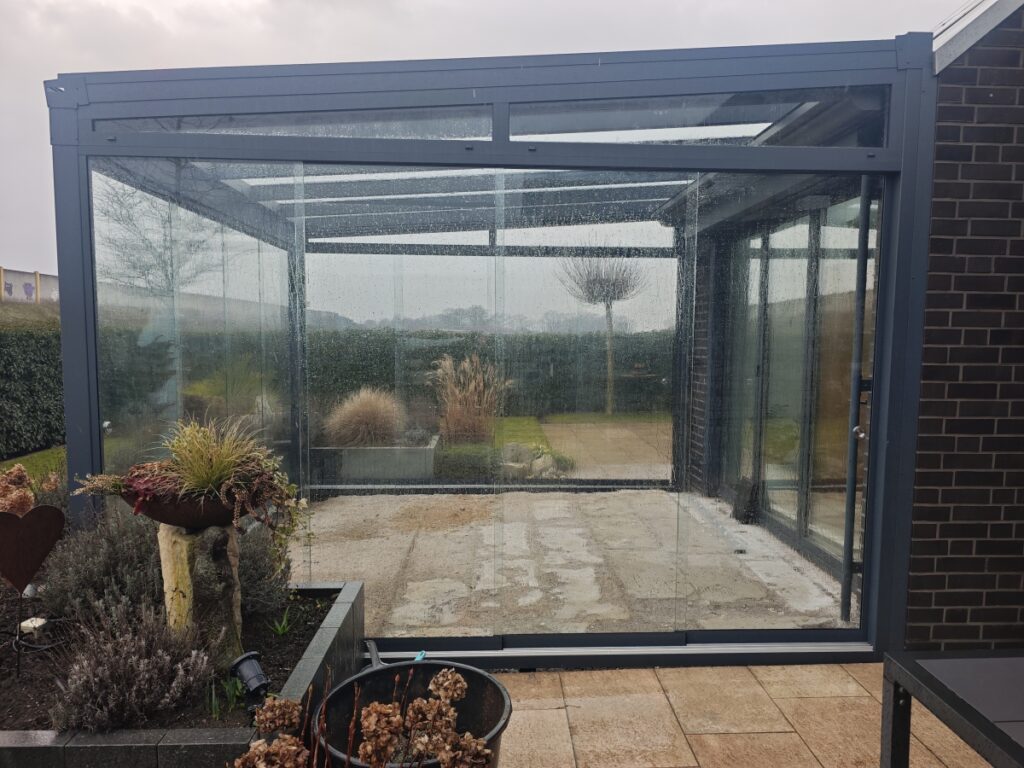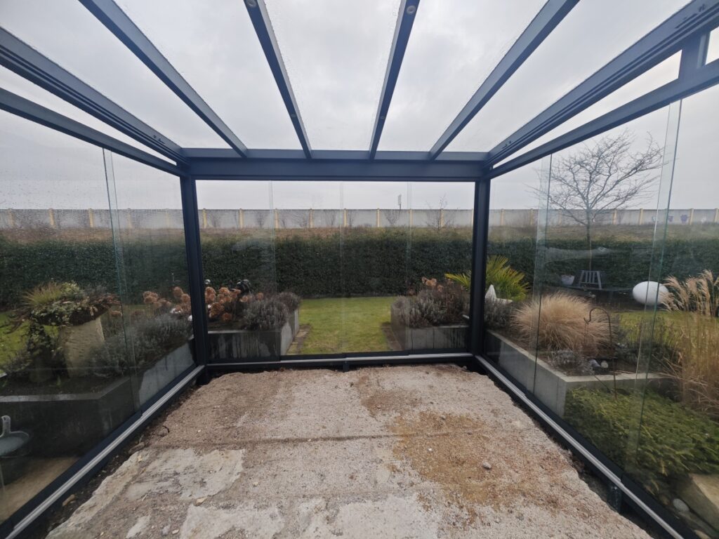 Das elegante Dach aus 8 mm Klarglas sorgt für maximalen Lichteinfall und schafft eine helle, offene Atmosphäre – geschützt und dennoch naturnah. Der integrierte Statikträger ohne Kern gewährleistet Stabilität bei gleichzeitig schlanker, moderner Optik. Zusätzliche Stützenverstärkungen auf Rinnen- und Wandseite sowie solide Stützen inklusive wandseitiger Ausführung garantieren höchste Standfestigkeit. Ein langlebiges Betonfundament bildet die zuverlässige Basis dieser Konstruktion.